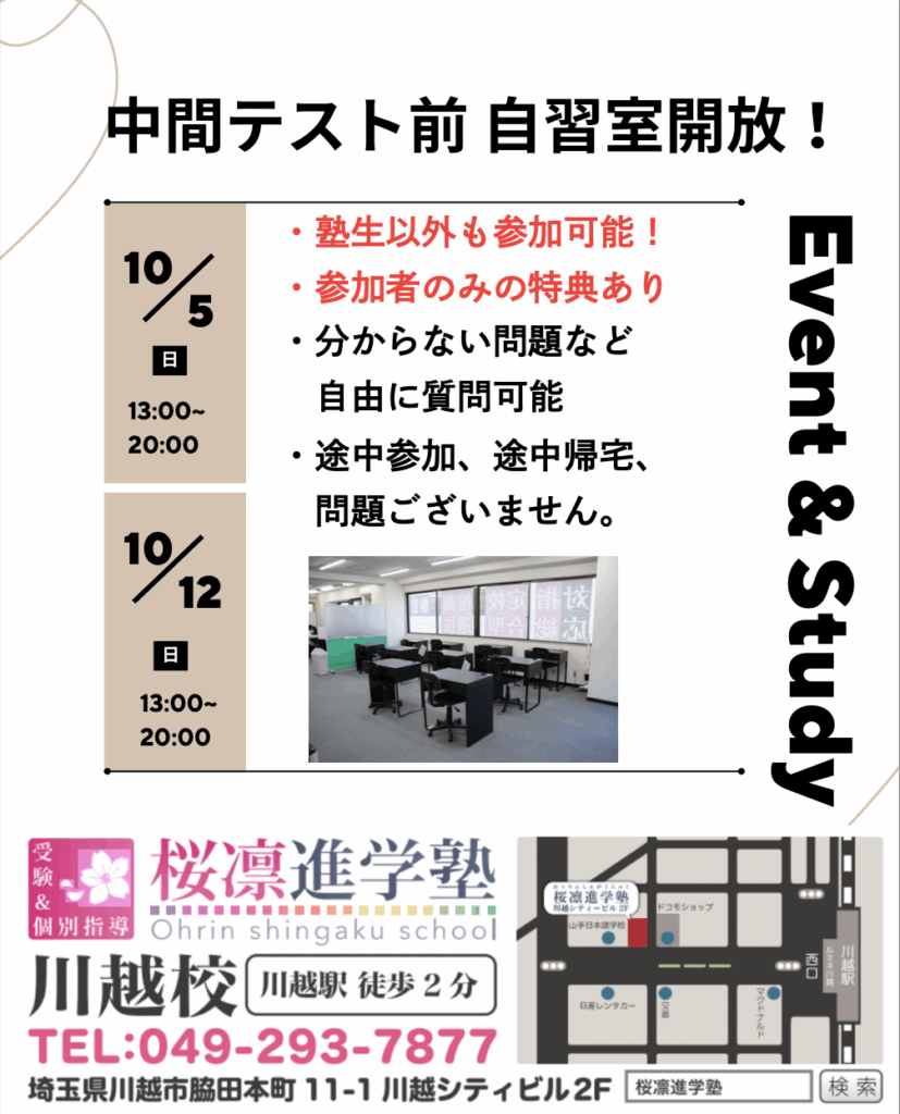 【塾生以外も利用可能!】10/5(日)、10/12(日) 中間テスト前 自習室開放!